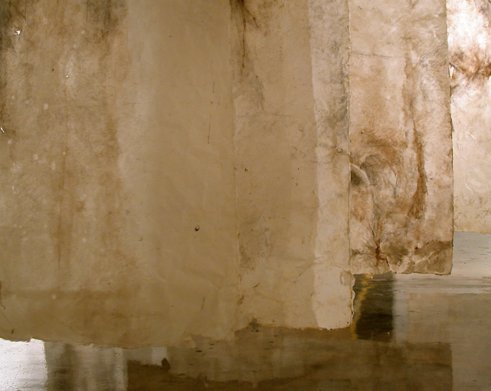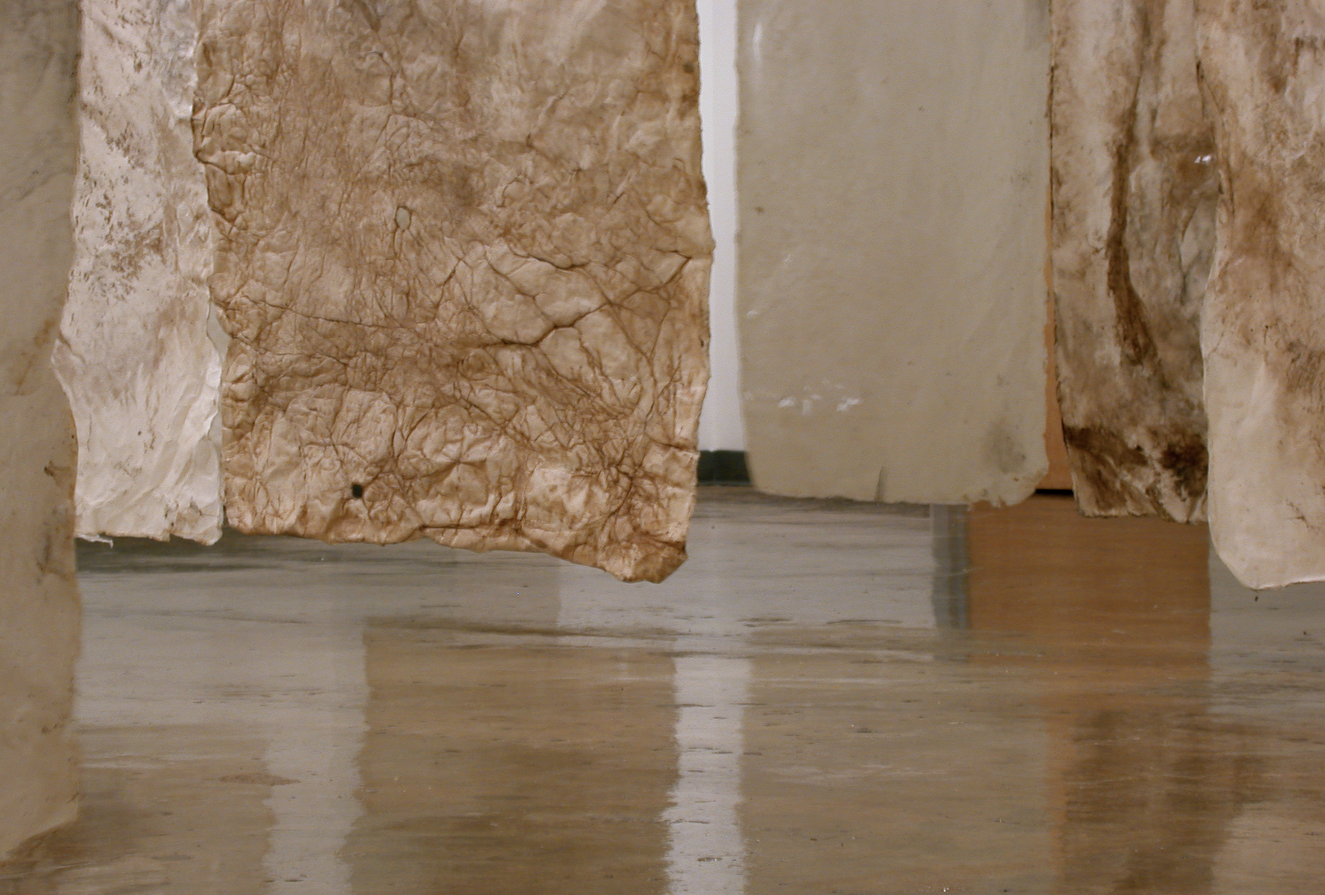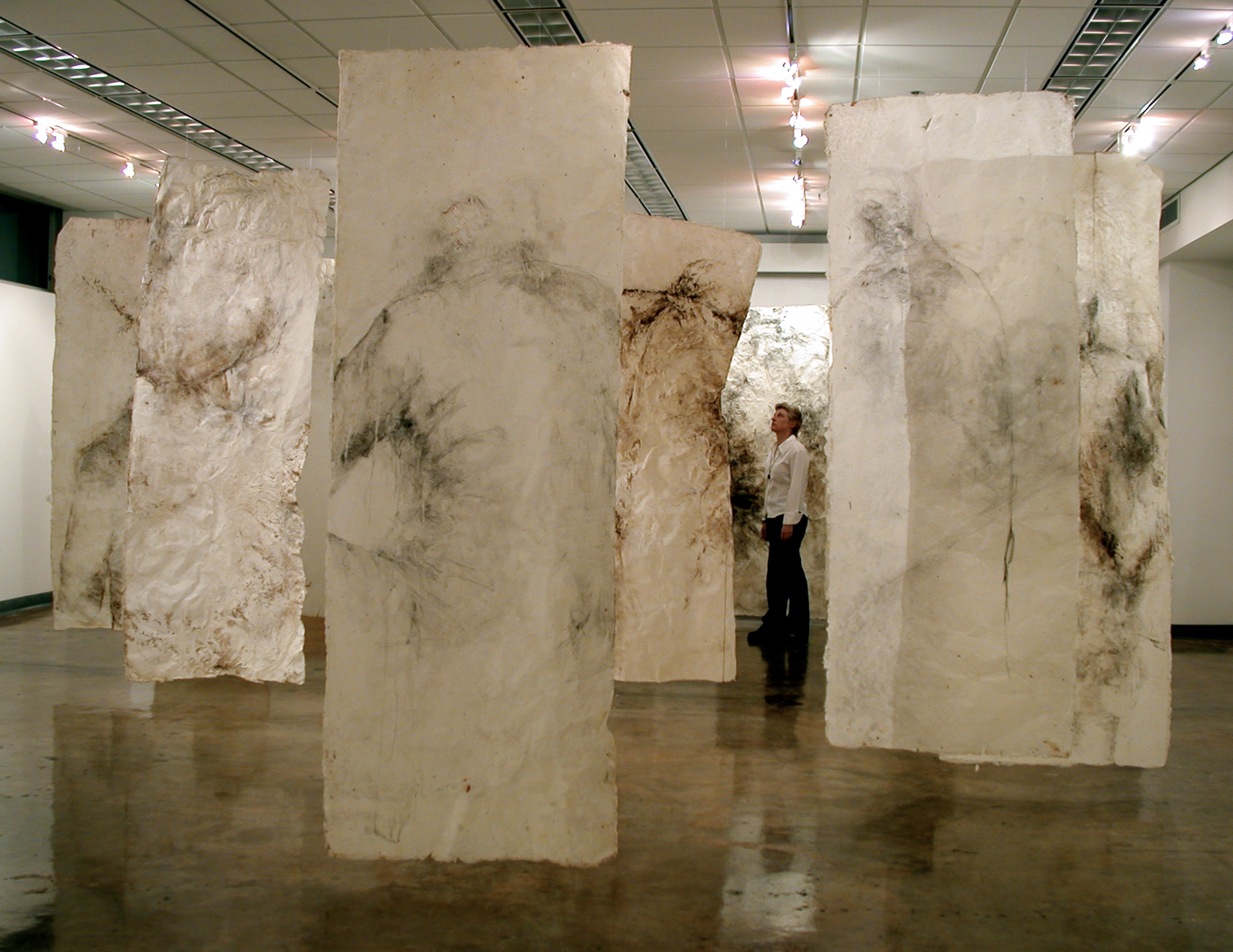 handmade paper, wax, charcoal, oil paint. each panel 108 x 36 in.